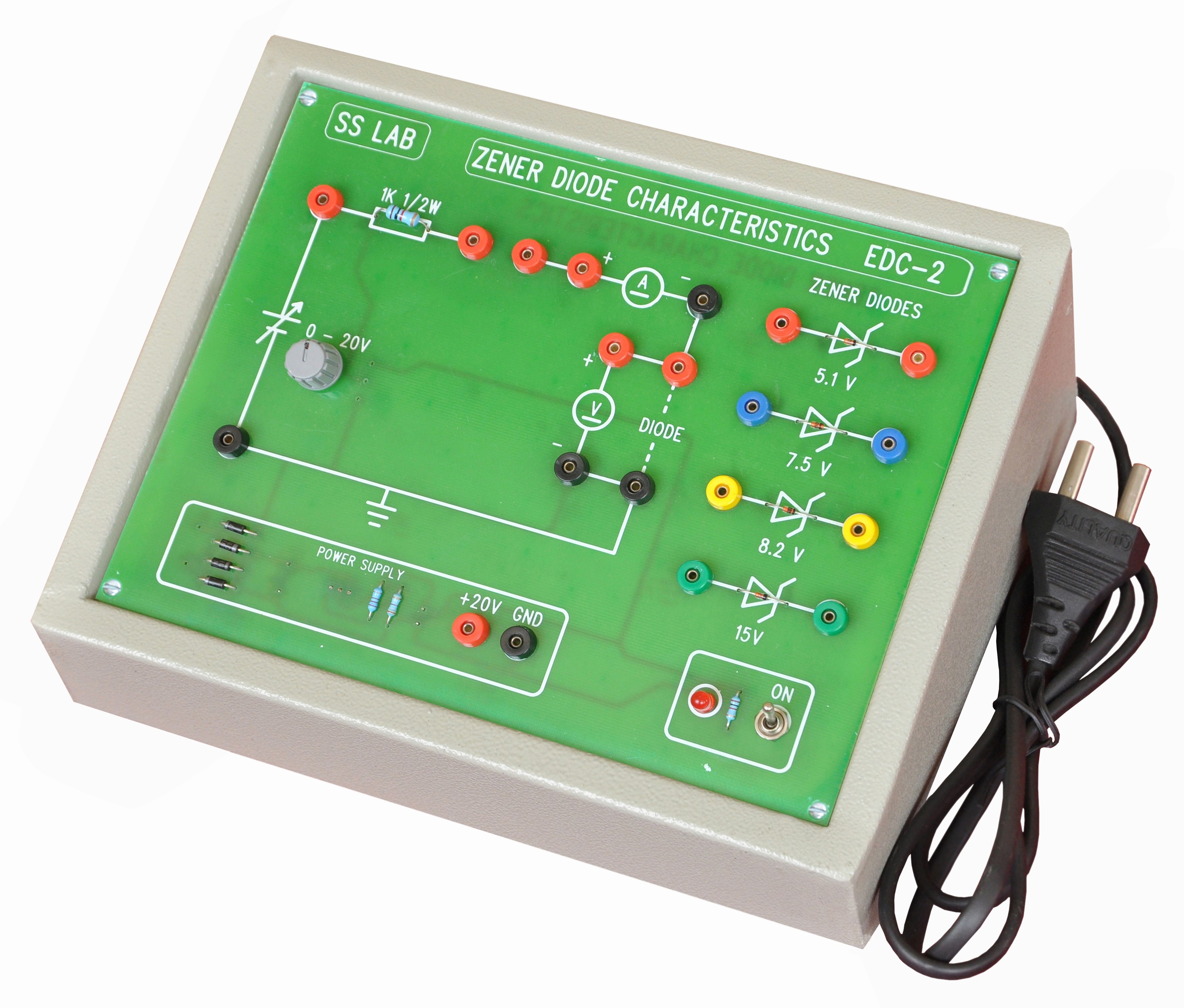Different values of three Zener diodes, Dual range DC voltmeter of 2V/20V, Dual range DC ammeter of 200�a/200mA are provided on board.