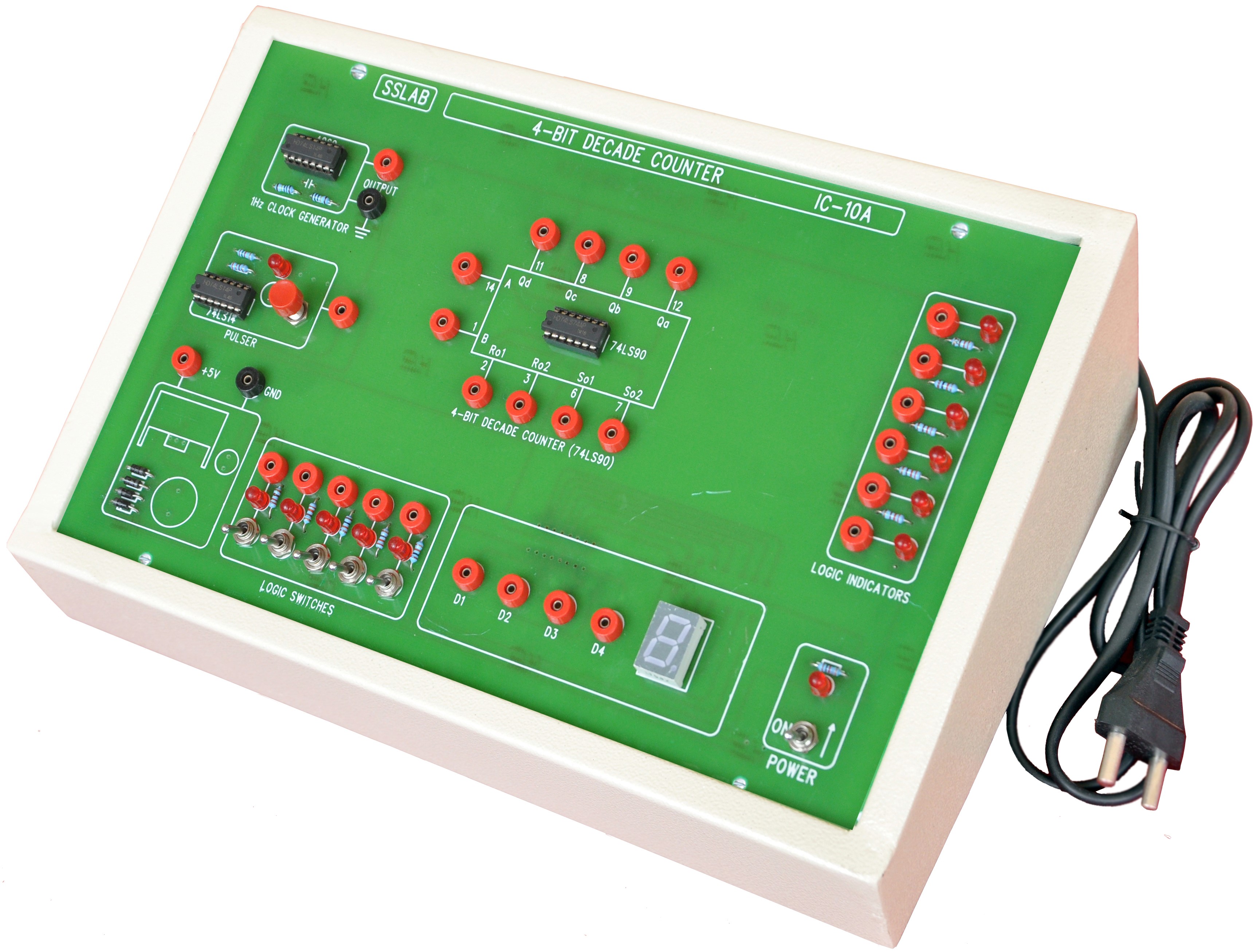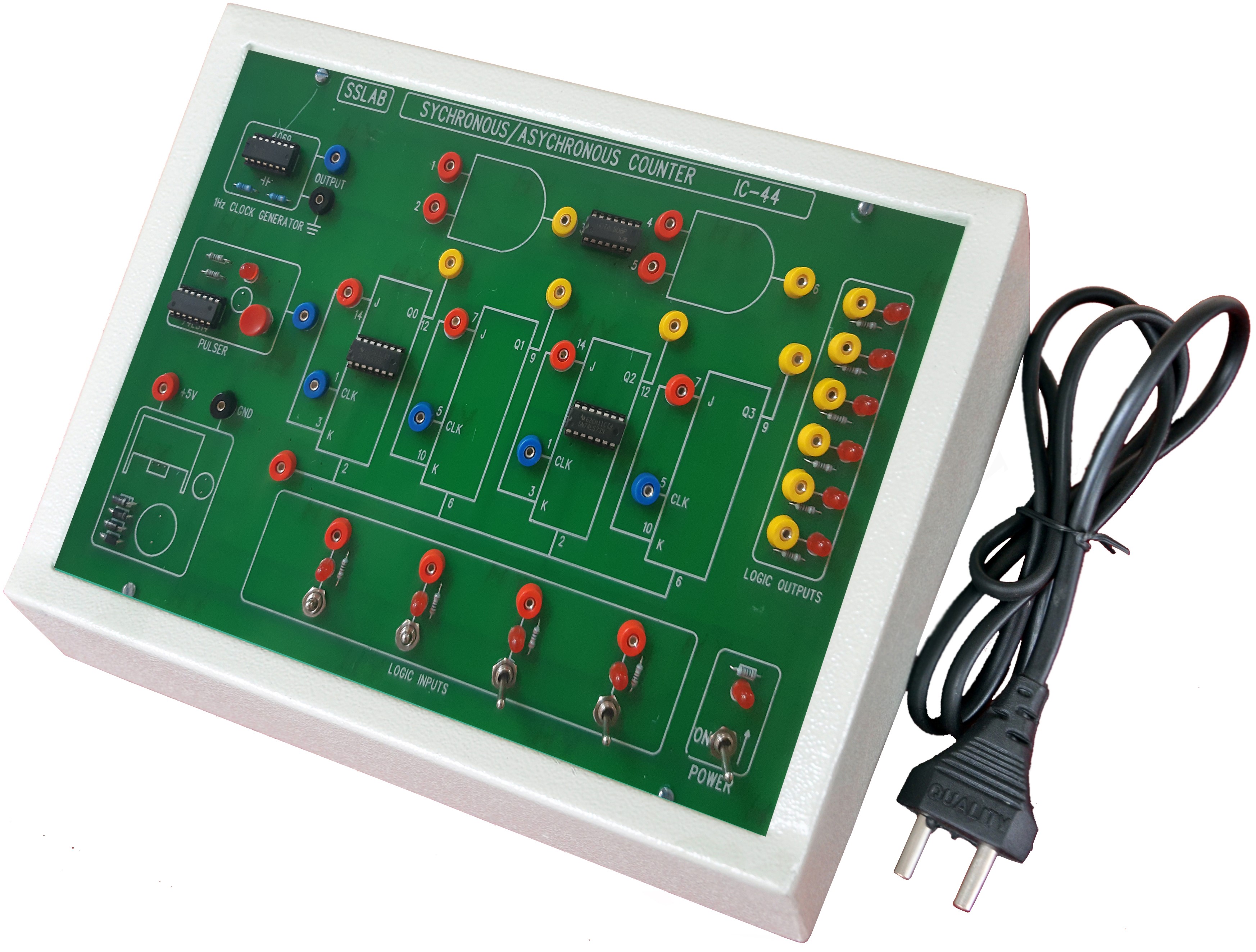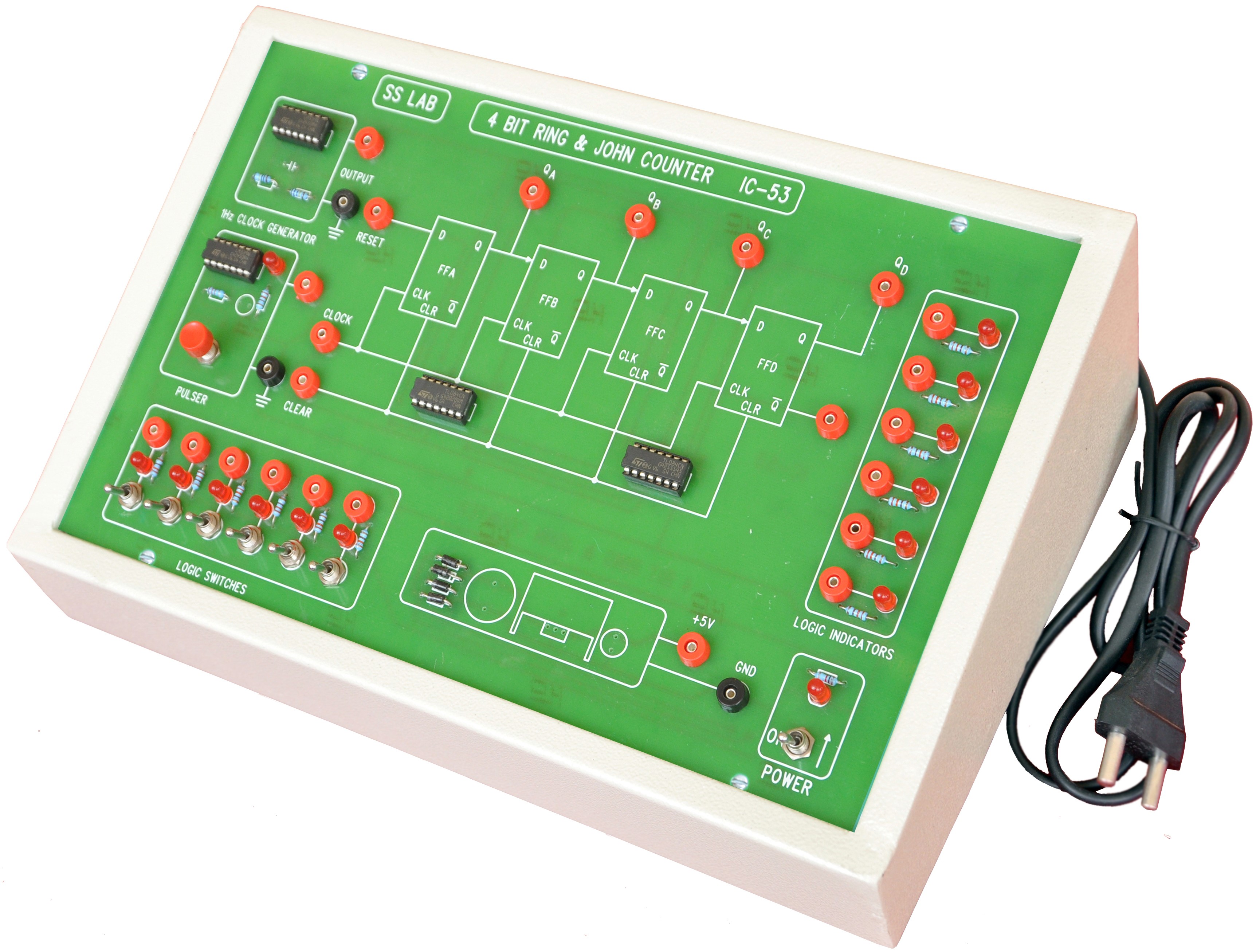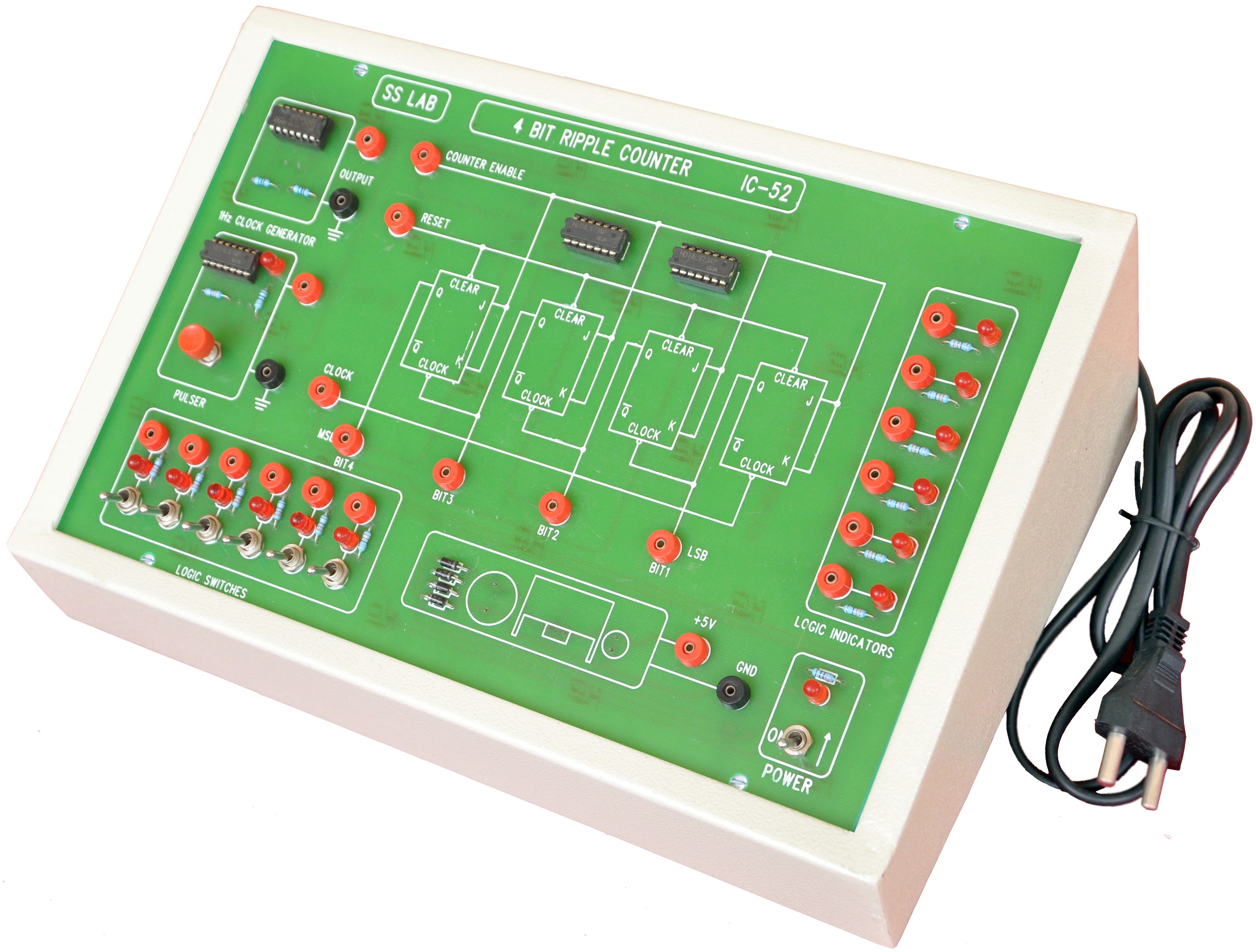 this unit Consist of two clock Generators /Pulser with 8 no�s of logic Indicator ,And 8 nos of logic output LED displays and 7 segment display designed with JK Flip Flops (74LS73) with help of NAND (74lS00)gates .