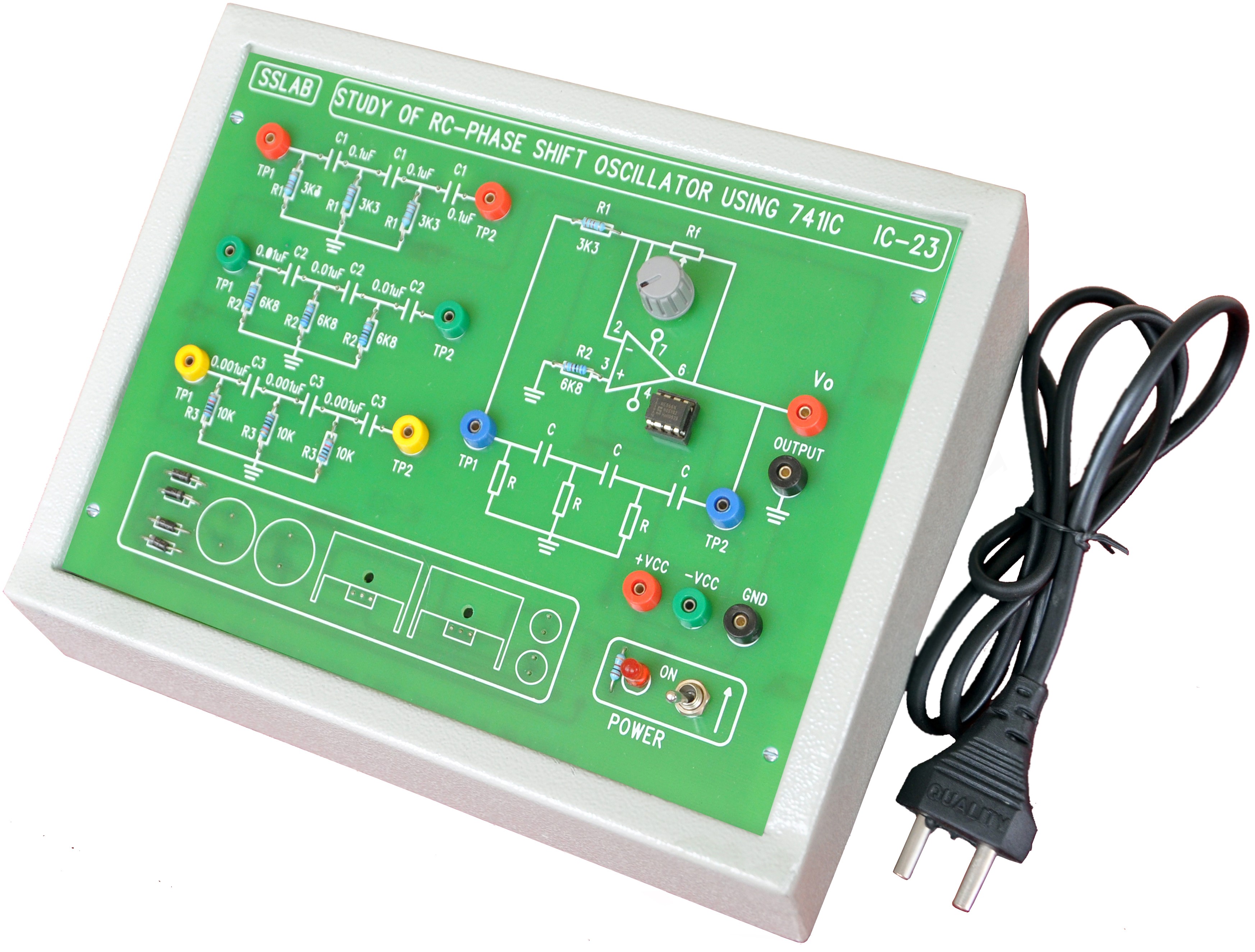 the circuit consist of Op amp 741IC with RC network input output coupling and three different phase shift circuits are provided on board.