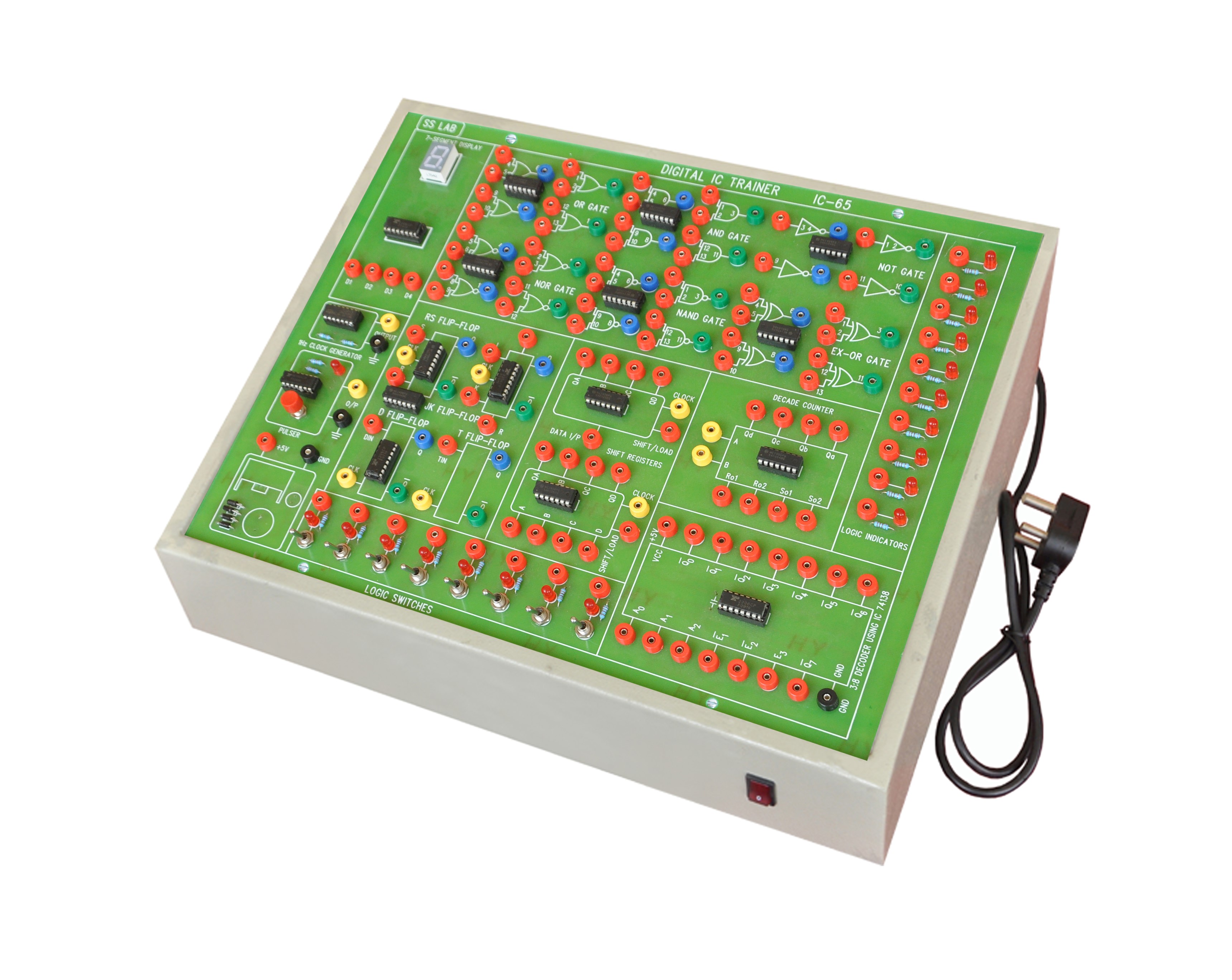 Trainer consist of clock generator, pulser, 4 no�s logic inputs and 8 no�s logic output with 74ls74 IC. D filp flop circuit.